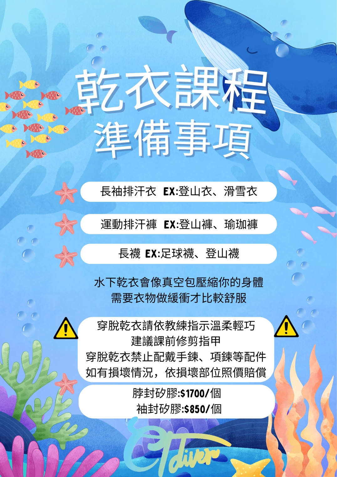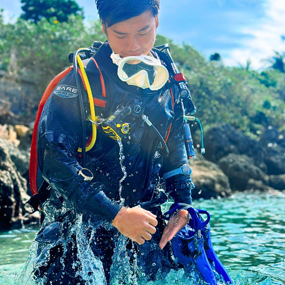 與濕式潛水衣不同,乾式潛水衣內部充滿空氣。 在你的乾衣課程中,你的教練將教你如何控制乾衣中的空氣以及浮力。